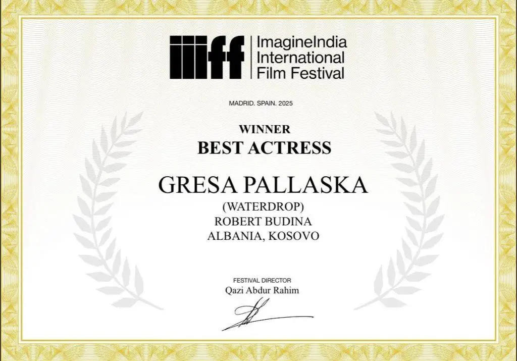 Aktorja e njohur kosovare Gresa Pallaska është nderuar me çmimin “Aktorja më e Mirë” në festivalin ndërkombëtar të filmit Imagineindia IFF në Madrid, për rolin e saj në filmin “Pikë Uji”. Ky vlerësim vjen si rezultat i një interpretimi të fuqishëm dhe emocional në një nga filmat më të përfolur shqiptarë të vitit.