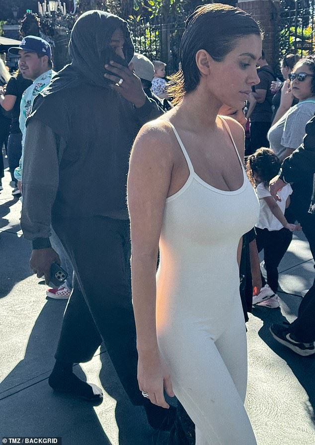 Gruaja e Kanye West, Bianca Censori kishte veshur një triko të ngushtë kur u shfaq në Disneyland të enjten me reperin dhe vajzën e tij 10-vjeçare North.