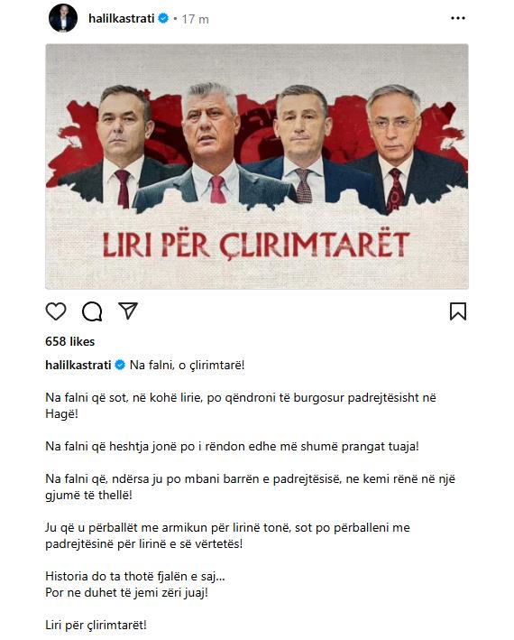 Përmes një postimi në Instagram, ai ka publikuar një fotografi të katër ish-krerëve të luftës – Hashim Thaçi, Kadri Veseli, Jakup Krasniqi dhe Rexhep Selimi – dhe ka shprehur shqetësimin për padrejtësinë që po u bëhet atyre.