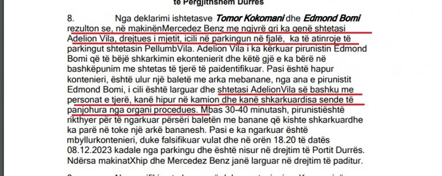 Më pas, efektivi Vila dhe personat e paidentifikuar kanë nisur shkarkimin e ngarkesës. Dy orë më pas, kamioni me kontejnerin ka hyrë sërish në Port, gjithnjë nën shoqërinë e punonjësit të Policisë, Adelion Vila.