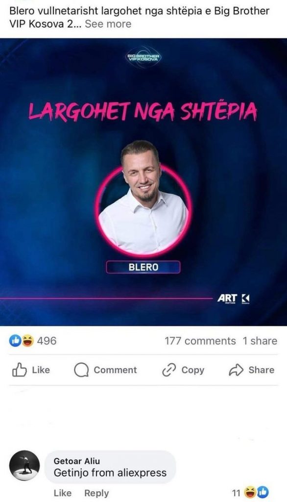 Mbrëmjen e djeshme Blero ndërpreu rrugëtimin e tij në “Big Brother Vip Kosova” duke deklaruar se nuk mund të qëndrojë më brenda shtëpisë sepse nuk mund të sillej si një person tjetër. Dhe vendimin e tij Getinjo e ka cilësuar si një formë kopjeje. Kujtojmë se edhe ai ishte vjet pjesë e “Big Brother Vip Kosova” dhe u largua vetë pas një muaji qëndrim.