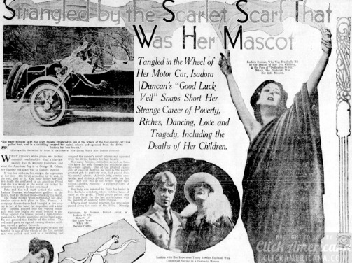 Isadora Duncan ishte e destinuar për një karrierë të shkëlqyer si kërcimtare moderne. Falë talentit të saj, ajo arriti në qytetin francez të Nisë nga vendlindja e saj San Francisko. Por në vitin 1927, ndërsa ngiste një kabrio, ajo mbështilli një shall të gjatë rreth qafës së saj. Mirëpo, në një moment lecka kapi në timonin e makinës dhe me forcë të madhe e hodhi Isadorën nga makina. Valltarja premtuese vdiq në vend vetëm në moshën 40-vjeçare.