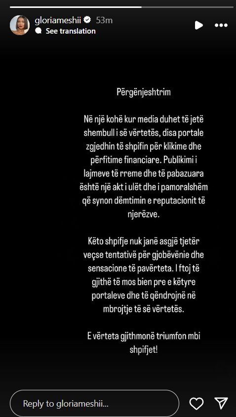 E rreth kësaj, Gloria ka reaguar ashpër duke i quajtur shpifje dhe të pavërteta këto lajme.