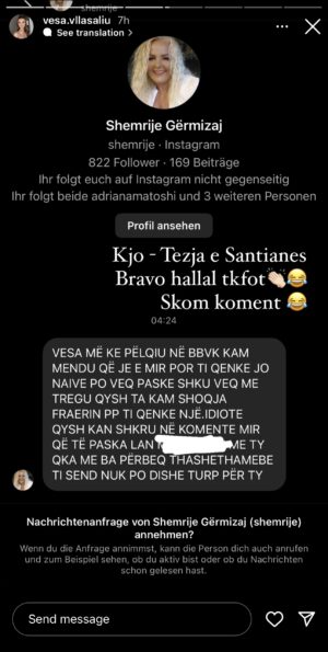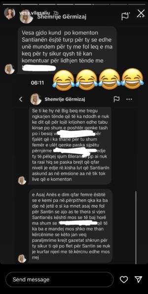 Tezja e një prej banoreve të “Big Brother VIp Kosova”, Santianës, i ka dërguar disa mesazhe ofenduese Vesa Vllasaliut.