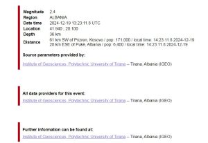 Lajme I fundit! Tërmet në Shqipëri 📅 19 December 2024 🕐 19.12.2024 👁 2 shikime I fundit Termeti dridh serish Shqipërinë epiqendra ne Pukë. Shqiperia-ime.com f 𝕏 W T