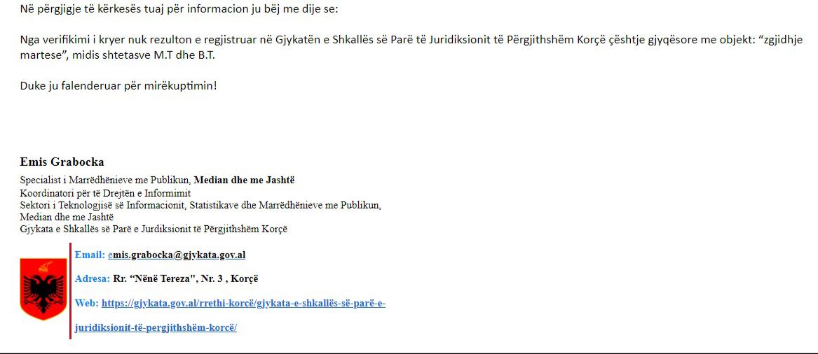 Së fundmi, nëpërmjet një komunikimi zyrtar për News24, rezulton se çifti nuk ka regjistruar pranë Gjykatës së Korçës, çështjen për shkurorëzim, edhe pse prej 4 muajsh që jetojnë të ndarë. Më herët policia në komunikatën për mediat, deklaroi se çifti është në proces divorci.