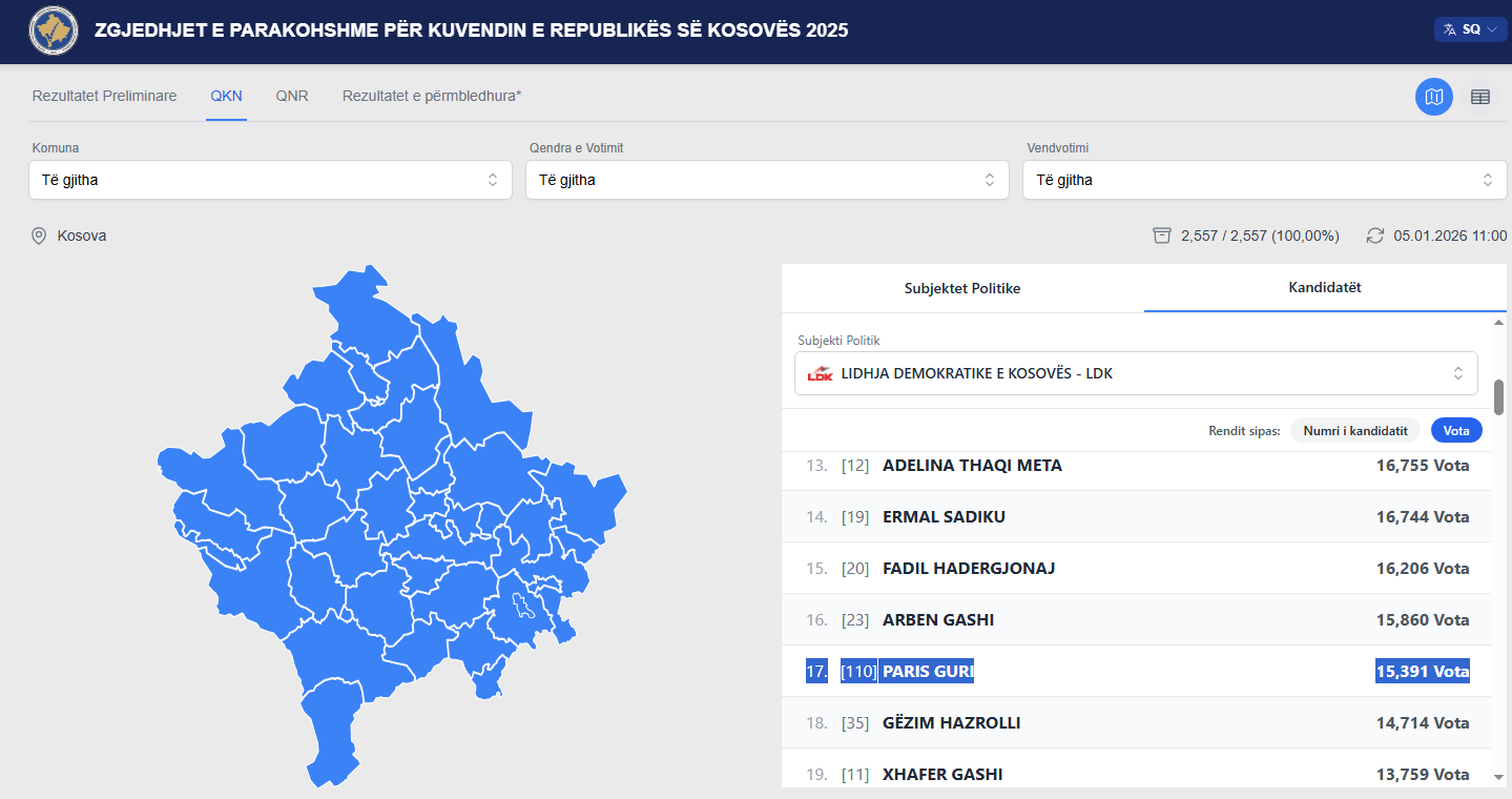 Nga rezultatet e zgjedhjeve të 28 dhjetorit, ai është renditur i 17-ti në listë, duke marrë gjithsej 15 mijë e 391 vota.