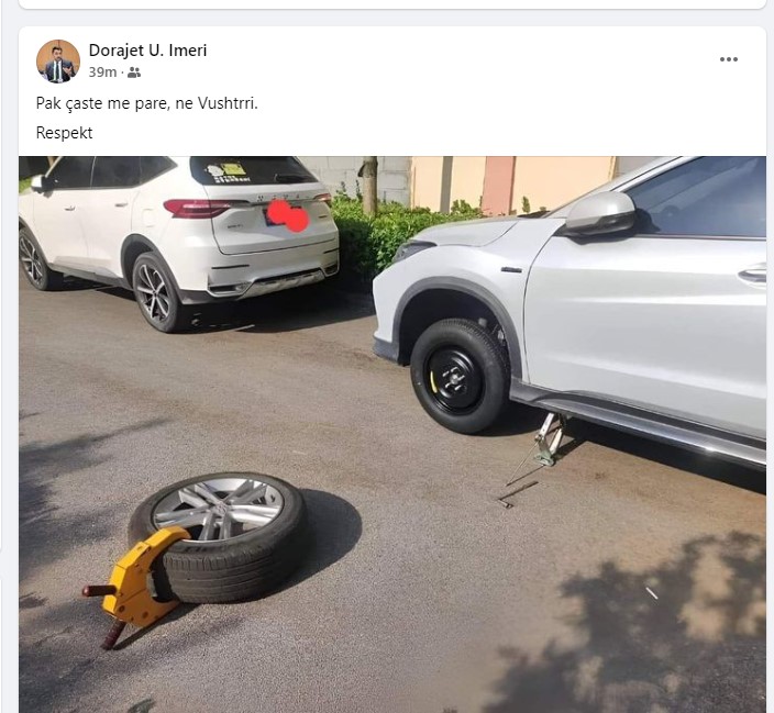 Një qytetar i Vushtrrisë ka publikuar një foto në Facebook ku shihet se një qytetar ka hequr ‘felnen’ së bashku me bllokuesin e vendosur nga kompania që mirëmbajnë parkingjet.