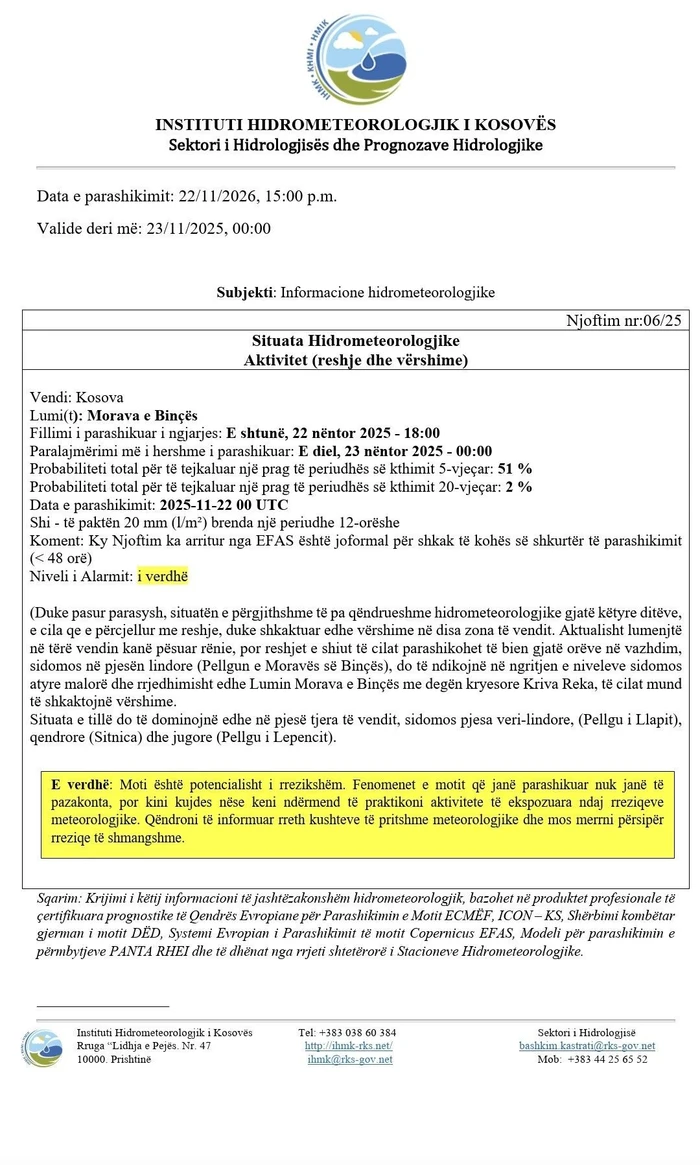 “Duke pasur parasysh, situatën e përgjithshme të pa qëndrueshme hidrometeorologjike gjatë këtyre ditëve, e cila përfshin reshje, duke shkaktuar edhe vërshime në disa zona të vendit. Aktualisht lumenjtë në tërë vendin kanë pësuar rënie, por reshjet e shiut të cilat parashikohen të bien gjatë orëve në vijim, sidomos në pjesën lindore (Pellgu e Moravës së Binçës), do të ndikojnë që të rriten përsëri prurjet e ujit nga pjesët e larta malore dhe rrjedhimisht edhe Lumin Morava e Binçës me degën kryesore Kriva Reka, të cilat mund të shkaktojnë vërshime”, thuhet në njoftim.