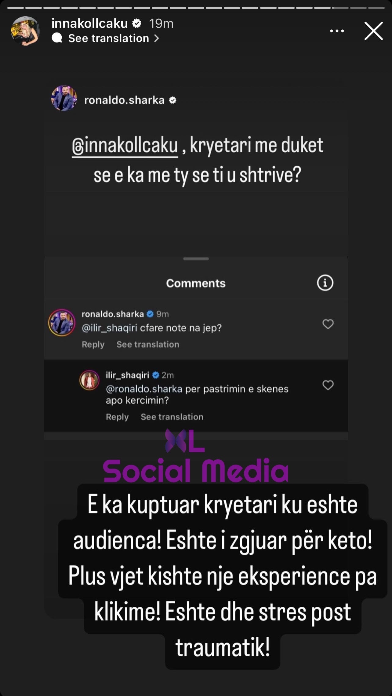 “Për pastrimin e skenës apo kërcimin?” – ka qenë komenti i Ilirit, referuar faktit që Ina u shtri në skenë – koment ky që Ronaldo Sharka e postoi në Instastory duke “nxitur” përgjigjen e Ina Kollçakut, e cila nuk nguroi aspak të përgjigjej me po të “njëjtën monedhë”.