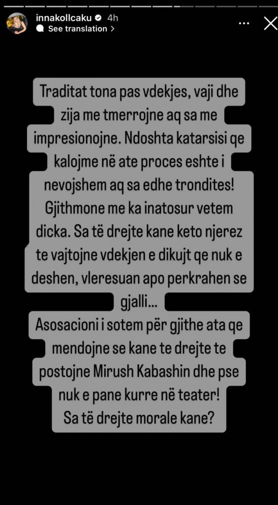 Por, këto mesazhe kanë revoltuar Ina Kollçakun, e cila në Instagram ka bërë një postim ku shkruan “të drejtë kanë këto njerëz të vajtojnë vdekjen e dikujt që nuk e deshën, vlerësuan apo përkrahën së gjalli”.