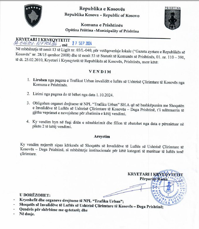 Komuna e Prishtinës ka marrë vendim që invalidët e luftës së Ushtrisë Çlirimtare të Kosovës nga Komuna e Prishtinës të lirohen nga pagesa e Trafikut Urban.