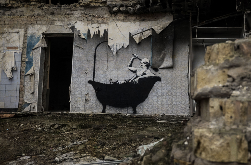Tre burra krijuan një mural që dukej si një mesazh nga një botë tjetër, simbol i qëndrueshmërisë dhe rezistencës. Njëri prej tyre, pa maskë dhe me proteza në këmbë dhe dorë, përfaqësonte një imazh që sfidon shkatërrimin, ndërsa dy të tjerët, të veshur me bluza gri dhe kapele baseball-i, përdorën sprej për të kthyer një mur të shkatërruar në një tablo surreale: një burrë me mjekër, në një vaskë mes rrënojave, duke fërkuar qetësisht shpinën.
