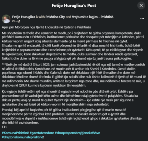 “Me shqetësim të thellë dhe zemërim të madh, po i drejtohem të gjitha organeve kompetente, duke përfshirë Komunën e Prishtinës, institucionet përkatëse dhe shoqatat për mbrojtjen e kafshëve, për t’i kërkuar veprim urgjent ndaj situatës alarmante që ka marrë përmasa të frikshme në qytet.