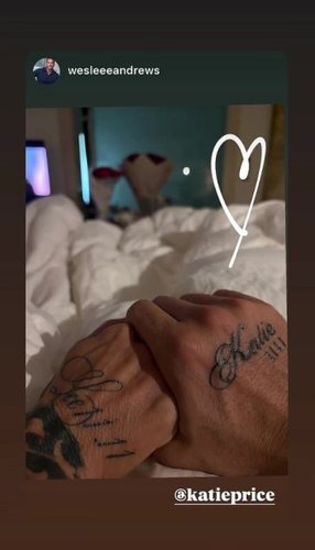 Në imazhet e publikuara, Katie shihet duke pozuar krah partnerit të saj përpara dhjetëra trëndafilave të kuq, ndërsa në njërën prej fotove bie në sy edhe dora e Lee Andrews, mbi të cilën ai duket se ka tatuazh emrin e saj.