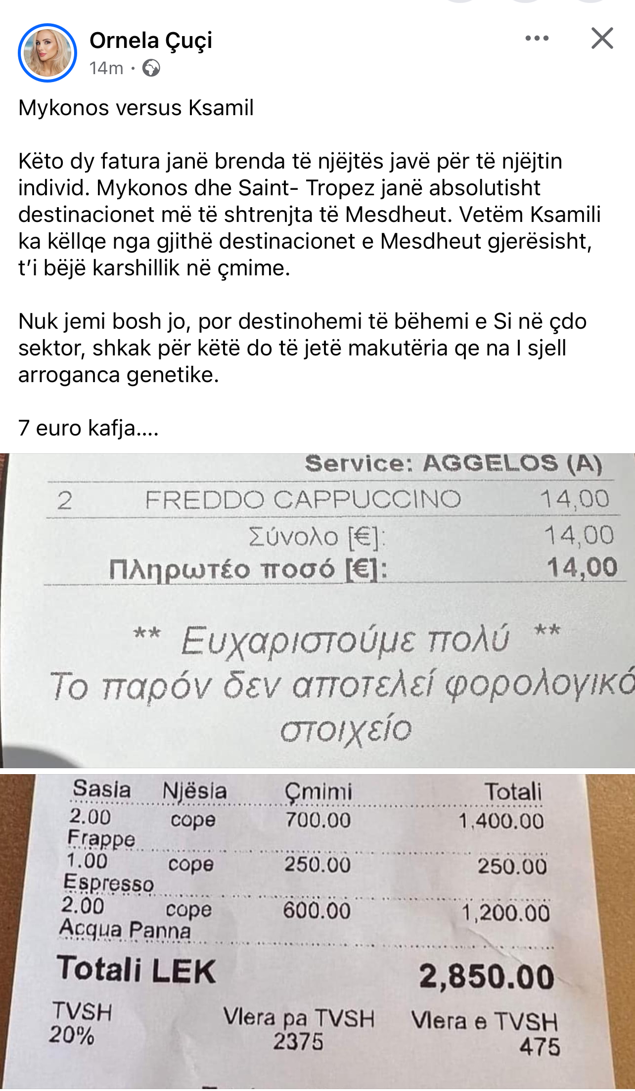 Çmimet e larta në bregdetin shqiptar i ka denoncuar dhe ish-zv.ministrja e Turizmit, Ornela Çuçi. Së fundi ajo ka postuar dy fatura nga Mykonos dhe Ksamili. Ky i fundit thotë ajo guxon t’i bëjë karshillëk me destinacioneve më të lakmuara në Mesdhe duke pasur 7 euro një kafe. Më poshtë reagimi i plotë i Çuçit.