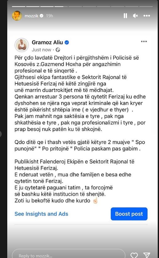 “Për çdo lëvdatë drejtori i përgjithshëm i Policisë së Kosovës z.Gazmend Hoxha për angazhimin profesional e të sinqertë. Gjithsesi ekipi fantastik i Sektorit Rajonal të Hetuesisë Ferizaj në këtë zinxhir, nga unë marrin duartrokitjet më të mëdhatë.