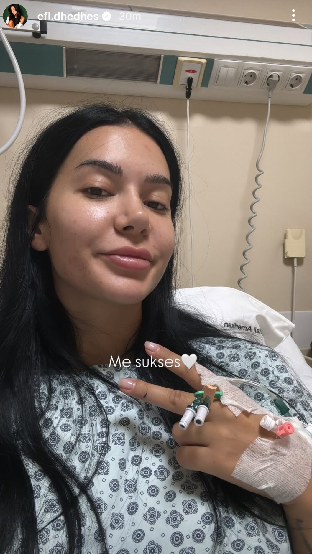 Pak orë më vonë, Efi ndau një tjetër foto, këtë herë me një buzëqeshje të lehtë dhe shenjën e paqes, ku shkruante “Me sukses”, duke qetësuar menjëherë fansat e saj.