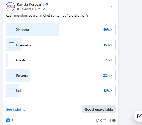 Me afro 50%, të votave publiku dëshiron ta sheh jashtë shtëpisë Xhenetën.