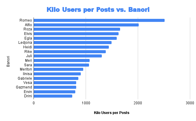 Numri mesatar i reagimeve për postim, duke llogaritur totalin e reagimeve dhe duke e ndarë me numrin total të postimeve për çdo banor, ka nxjerrë në vend të parë Romeon, të ndjekur nga Alfio, Elvisi, Roza, Egla, Ledjona, Heidi, Rikja, Juli, Meri, Sara, Meriton, Ilnisa, Gabriele, Vesa, Gazmenti, Ervini dhe Drini. ‘Kilo User per Post’ është një tregues që ofron një vlerësim më të thellë të marrëdhënies ndërmjet ndjekësve dhe banorëve, duke zbuluar preferencat e tyre dhe angazhimin e tyre ndaj personaliteteve të ndryshme.