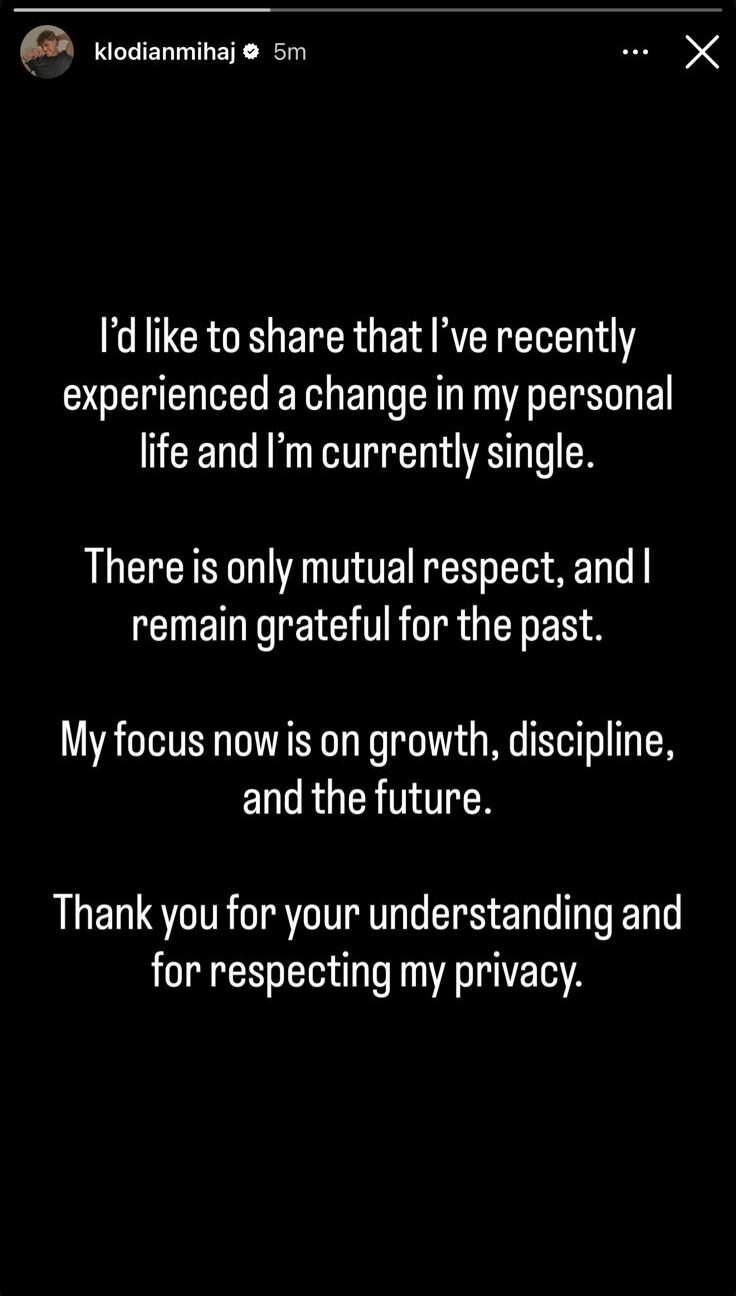 Në mesazhin e tij drejtuar ndjekësve, Klodi sqaroi se tashmë është “single”, por theksoi se ndarja nuk ka lënë hapësirë për hiri. Ai u shpreh se mes tyre ekziston ende një respekt i madh reciprok dhe se ndihet mirënjohës për gjithçka që kanë kaluar së bashku në të kaluarën.