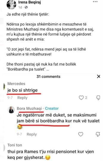 Në një video të pak ditëve më parë, që vetë Muzhaqi e ka publikuar në rrjetet sociale, ka rënë në sy komenti i një ndjekësi, i cili i ka shkruar “Jë bërë si shtrigë”. Përgjigjja e ministres ishte: “maksimumi jam si borëbardha pa tualet”.
