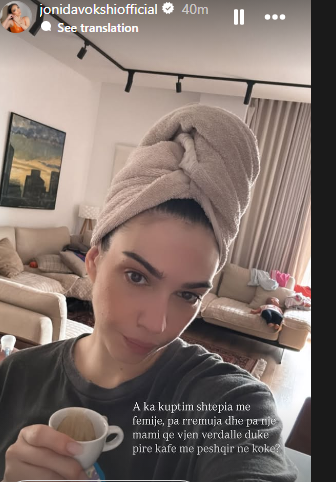Moderatorja dhe aktorja e njohur, Jonida Vokshi, ka ndarë një moment të sinqertë nga jeta e saj e përditshme si nënë. Në një postim në Instagram, ajo shfaqet me një filxhan kafeje në dorë dhe një peshqir të mbështjellë në kokë, ndërsa në sfond duket rrëmuja tipike e një shtëpie me fëmijë.