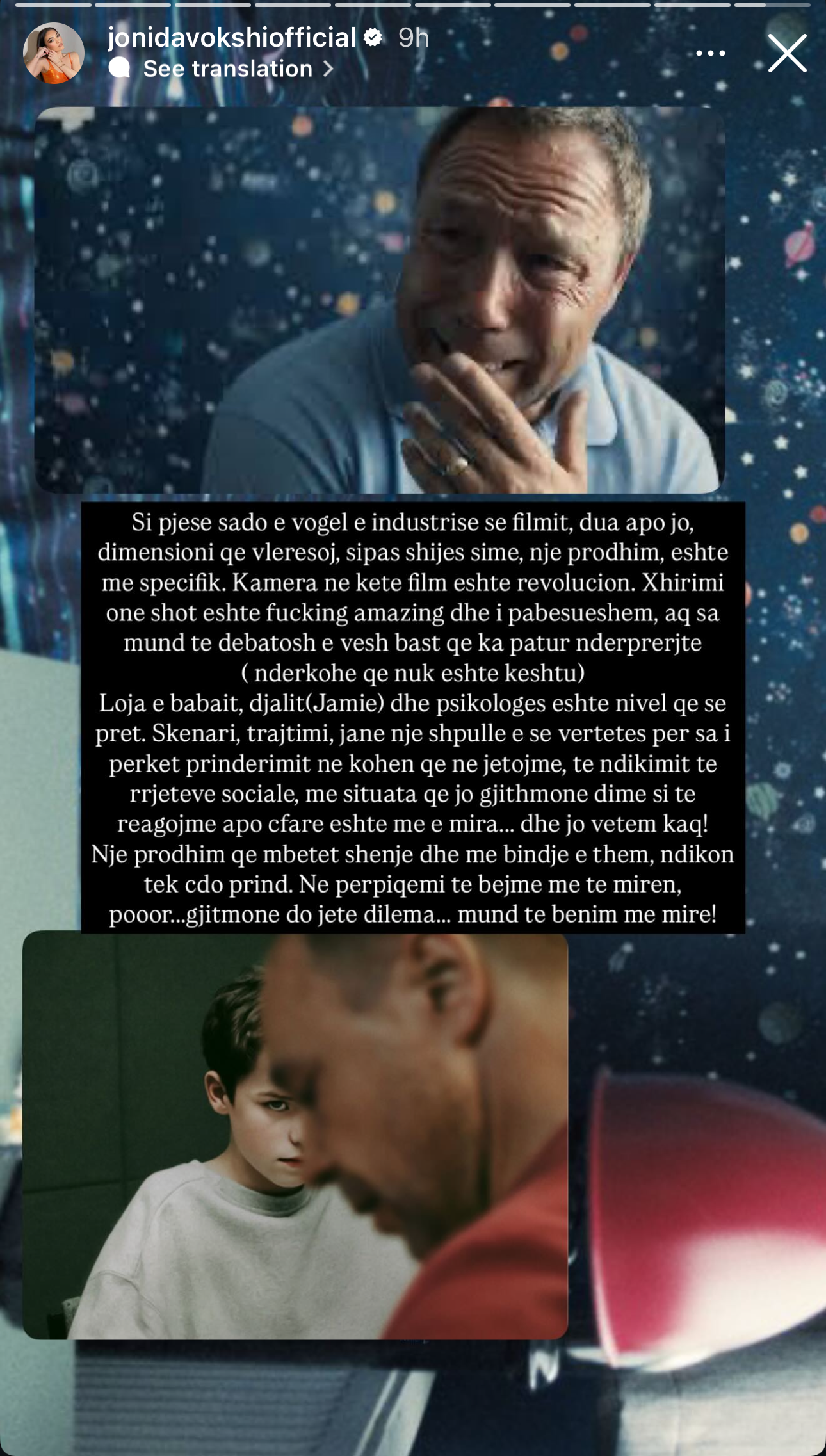 Si pjesë, sado e vogël, e industrisë së filmit, dua apo jo, dimensioni që vlerësoj, sipas shijes sime, një prodhim është më specifik. Kamera në këtë film është revolucion. Xhirimi “one shot” është fucking amazing dhe i pabesueshëm, aq sa mund të debatosh e vesh bast se ka patur ndërprerje (ndërkohë që nuk është kështu). Loja e babait, djalit (Jamie) dhe psikologes është një nivel që nuk e pret. Skenari, trajtimi, janë një shpërthim i së vërtetës për sa i përket prindërimit në kohën që jetojmë, ndikimit të rrjeteve sociale, me situata që jo gjithmonë dimë si të reagojmë apo çfarë është më e mira… dhe jo vetëm kaq!