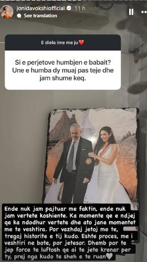 “Ka momente që e ndjej që ka ndodhur vërtet dhe ato janë momentet më të vështira.Por vazhdon të jetojë me ne, tragjedi historite e tij kudo. Është procesi më i vështirë në botë, për jetësor. Dhemb për tërë jetën, por e luftosh që ai të jetë krenar për ty, prej nga kudo që të sheh e të ruan,” ka shkruar Jonida bashkëngjitur një fotografie të saj me të atin.