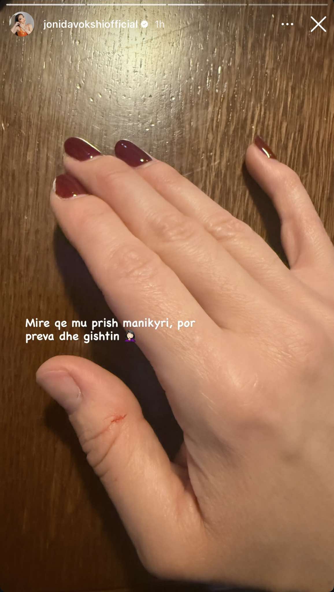 Gjendjen e dorës me thoin që mungon e ka shfaqur përmes një story në Instagram, ku ka treguar momentin e vogël të sikletshëm para daljes live.