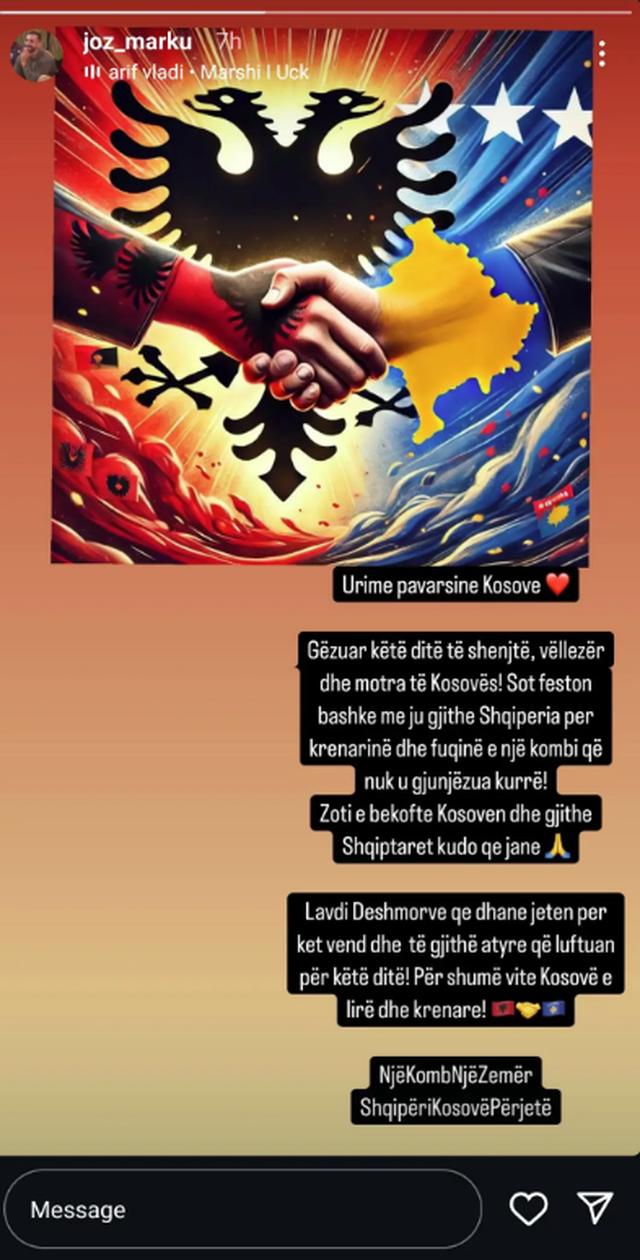 Në një kthesë të ngjarjeve, sot, në Ditën e Pavarësisë së Kosovës, Jozi publikoi një mesazh urimi në llogarinë e tij në Instagram: