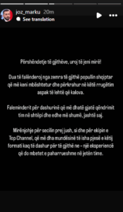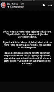 Në postimin e tij thuhet “U futa në ‘Big Brother’ dhe zgjodha të luaj fort. Të paktë ishin ata që kuptuan lojën dhe vërtetësinë time. Zgjodha të isha i sinqertë, i drejtpërdrejt, pa filtra dhe ndoshta pikërisht kjo më kushtoi në këtë rrugëtim, ndjesë për këdo që mund të këtë përjetuar keq atë që ndodhi. Por ju siguroj se presioni, veprat dhe ngacmimet kanë qenë të shumta gjatë rrugëtimit tim kundrejt meje në shtëpi”.