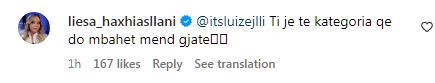 Madje, ai s’vonoi të komentonte në postim: “O teze”, duke etiketuar Liesën. Kjo e fundit ia ktheu: “Ti je kategoria që do mbahet mend gjatë”.