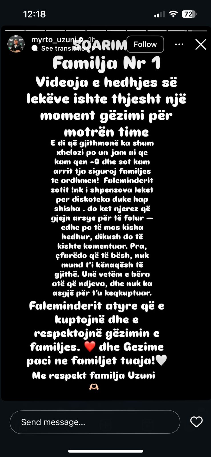“Faleminderit atyre që e kuptojnë dhe respektojnë gëzimin e familjes! Gëzimë paçi në familjet tuaja! Me respekt, familja Uzuni.”