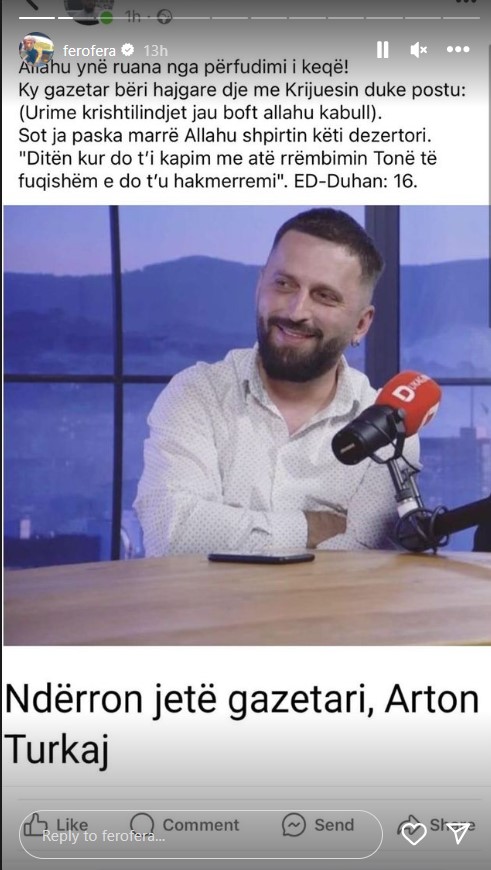 Përmes disa postimeve në “Instagram”, Feri i cili prej kohësh është larguar nga muzika pasi i është përkushtuar fesë, është shprehur se ndarja nga jeta e gazetarit ishte “dënim” nga Allahu, pasi ky i fundit kishte ironizuar fetë në ditën e Krishtlindjeve.