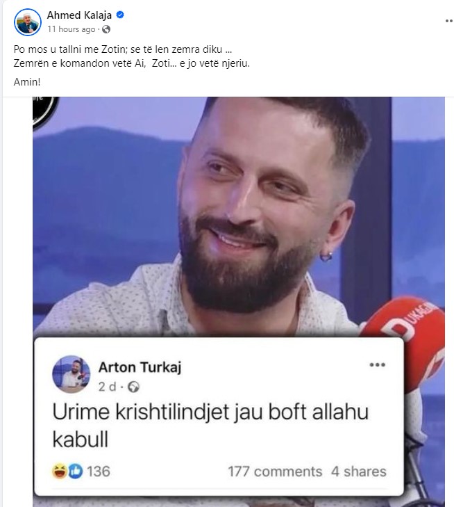 Gjithashtu, lidhur me vdekjen e gazetarit ka reaguar edhe Imami Ahmed Kalaja. Në llogarinë e tij në “ Facebook”, Imami ka publikuar statusin: “Po mos u tallni me Zotin; se të len zemra diku …Zemrën e komandon vetë Ai, Zoti… e jo vetë njeriu. Amin!”