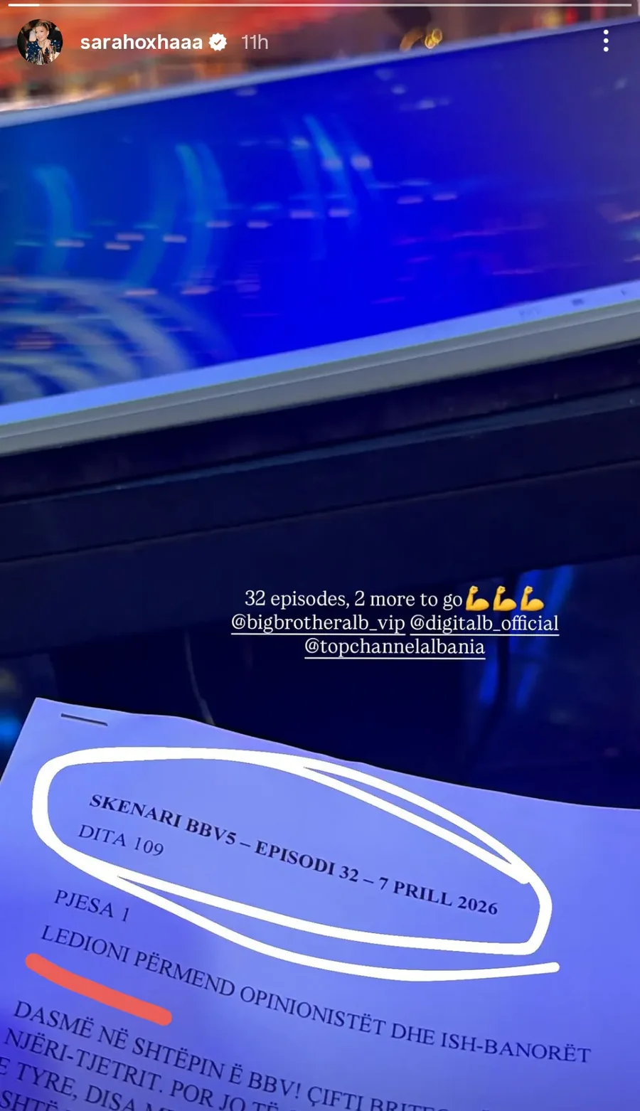 Mbi imazhin e skenarit, Sara ka shkruar me krenari: “32 episode, edhe 2 kanë mbetur”, duke paralajmëruar kështu afrimin e finales së madhe.
