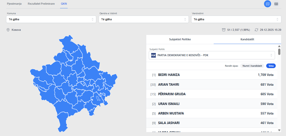 Tashmë janë procesuar 1.99% e votave të numëruara të kandidatëve për deputetë. Nga Partia Demokratike e Kosovës, lideri i saj, Bedri Hamza aktualisht ka marrë një mijë e 709 vota.