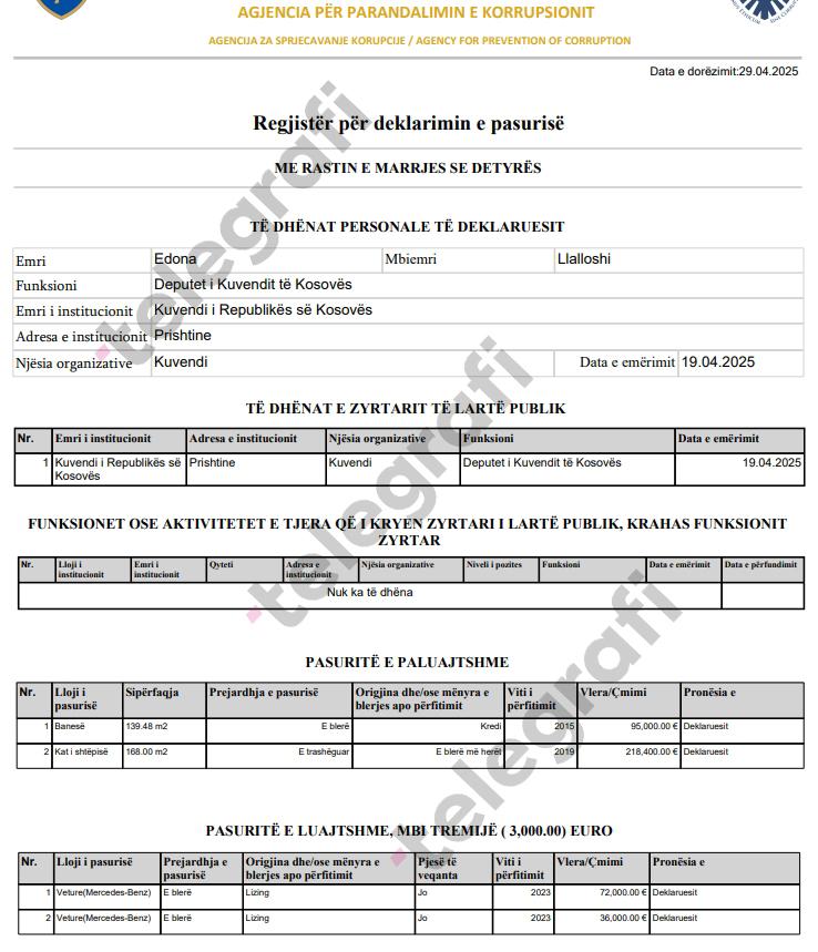 Deputetja dhe këngëtarja e njohur shqiptare, Edona Llalloshi, ka dorëzuar deklarimin e pasurisë më 19 prill 2025 me rastin e marrjes së detyrës në Kuvendin e Republikës së Kosovës, duke ofruar një pasqyrë të detajuar të gjendjes së saj financiare dhe pronësore.