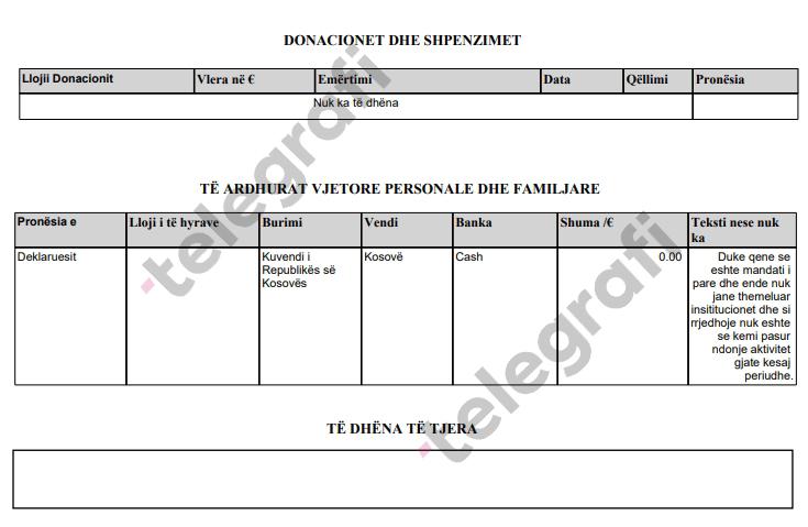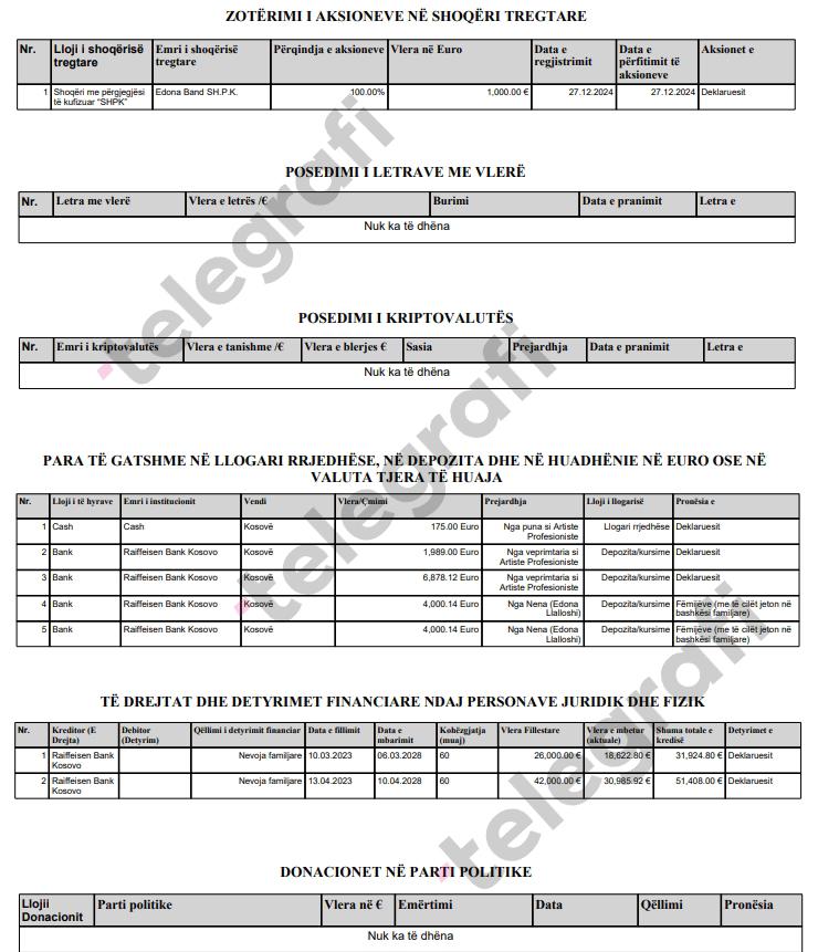 Ndërkohë, si artiste profesioniste, Llalloshi ka deklaruar të ardhura dhe para të gatshme në disa llogari bankare dhe në cash. Në total, ajo ka rreth 13 mijë euro kursime, përfshirë edhe 8 mijë euro të ndara në dy llogari bankare në emër të fëmijëve të saj, të cilët jetojnë me të në bashkësi familjare. Një tjetër detaj që bie në sy është se ajo është pronare e vetme (100%) e kompanisë “Edona Band SH.P.K.”, të regjistruar më 27 dhjetor 2024 me një kapital fillestar prej 1 mijë euro.