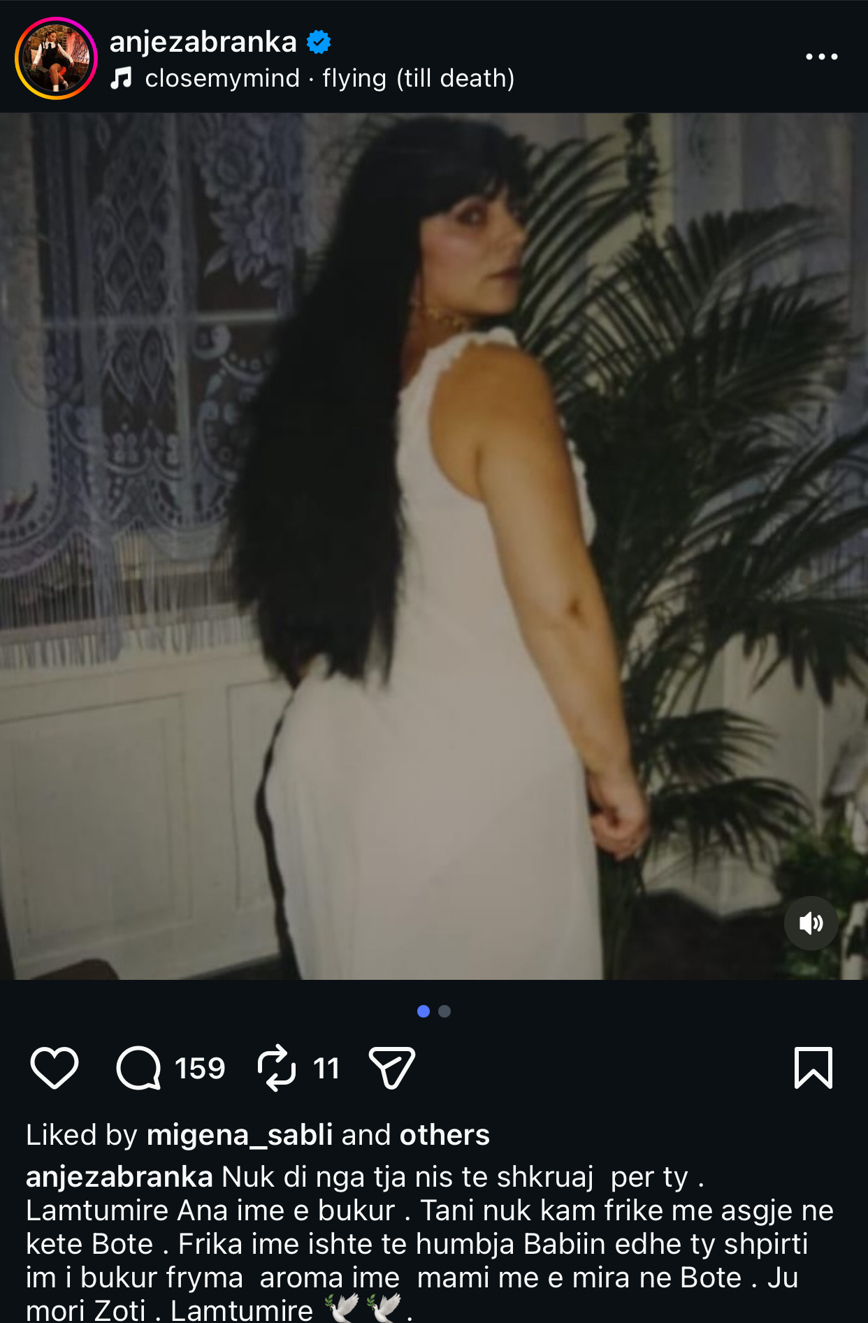 “Nuk di nga tja nis te shkruaj per ty . Lamtumire Ana ime e bukur . Tani nuk kam frike me asgje ne kete Bote . Frika ime ishte te humbja Babiin edhe ty shpirti im i bukur fryma aroma ime mami me e mira ne Bote . Ju mori Zoti . Lamtumire”, shkruan këngëtarja në Instagram.