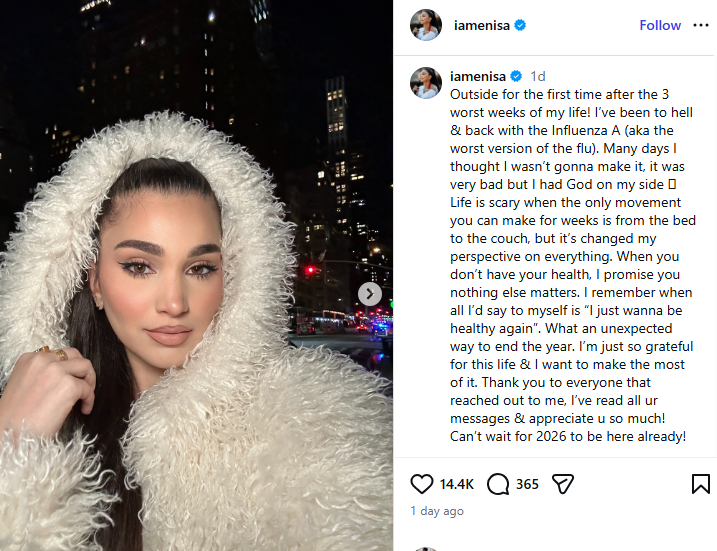 “Jashtë për herë të parë pas 3 javëve më të këqija të jetës sime! Kam parë tmerr me gripin A (i njohur edhe si varianti më i keq i gripit). Shumë ditë mendova se nuk do t’ia dilja, ishte shumë keq, por kisha Zotin në krah. Jeta është e frikshme kur e vetmja lëvizje që mund të bësh për javë të tëra është nga krevati në divan, por më ndryshoi këndvështrimin në gjithçka. Kur nuk ke shëndetin, asgjë tjetër s’ka rëndësi. Më kujtohet kur gjithë çfarë i thosha vetes ishte që dua vetëm të jem sërish e shëndetshme. Çfarë mënyre e papritur për të mbyllur vitin. Jam shumë mirënjohëse për këtë jetë dhe dua t’i marr më të mirën. Faleminderit kujtdo që më kontaktoi, i kam lexuar të gjitha mesazhet tuaja dhe ju vlerësoj shumë! Mezi pres që të vijë 2026!”, shkruan Enisa në postimin e saj në “Instagram”.