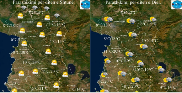 Moti do të jetë më intervale kthjellimesh si dhe alternime vranësirash të cilat do të pasohen me reshje shiu me intensitet të ulët dhe shtrëngata afatshkurtra lokale në pjesën më të madhe të vendit nga orët e mesditës deri në orët e pasdites.
