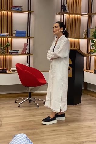 Duma gjatë një prezantimi shfaqet me një fustan të thjeshte në të bardhë, ku ka marrë komente të shumta pozitive nga ndjekësit,