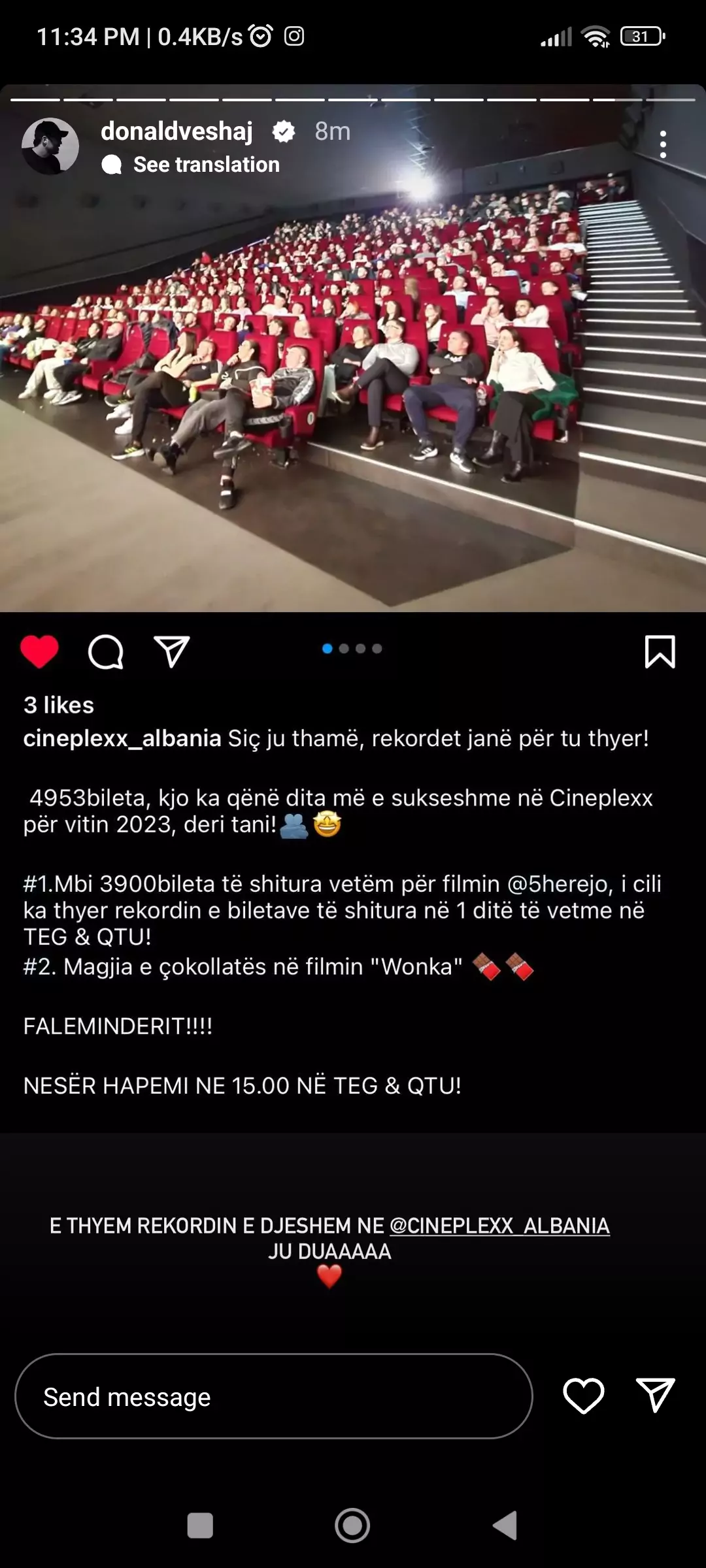 Mbi 3900bileta të shitura vetëm për filmin @5herejo, i cili ka thyer rekordin e biletave të shitura në 1 ditë të vetme në TEG & QTU!”, thuhet në postim