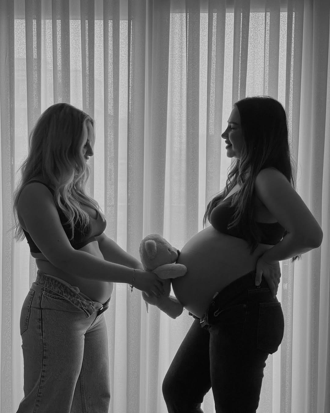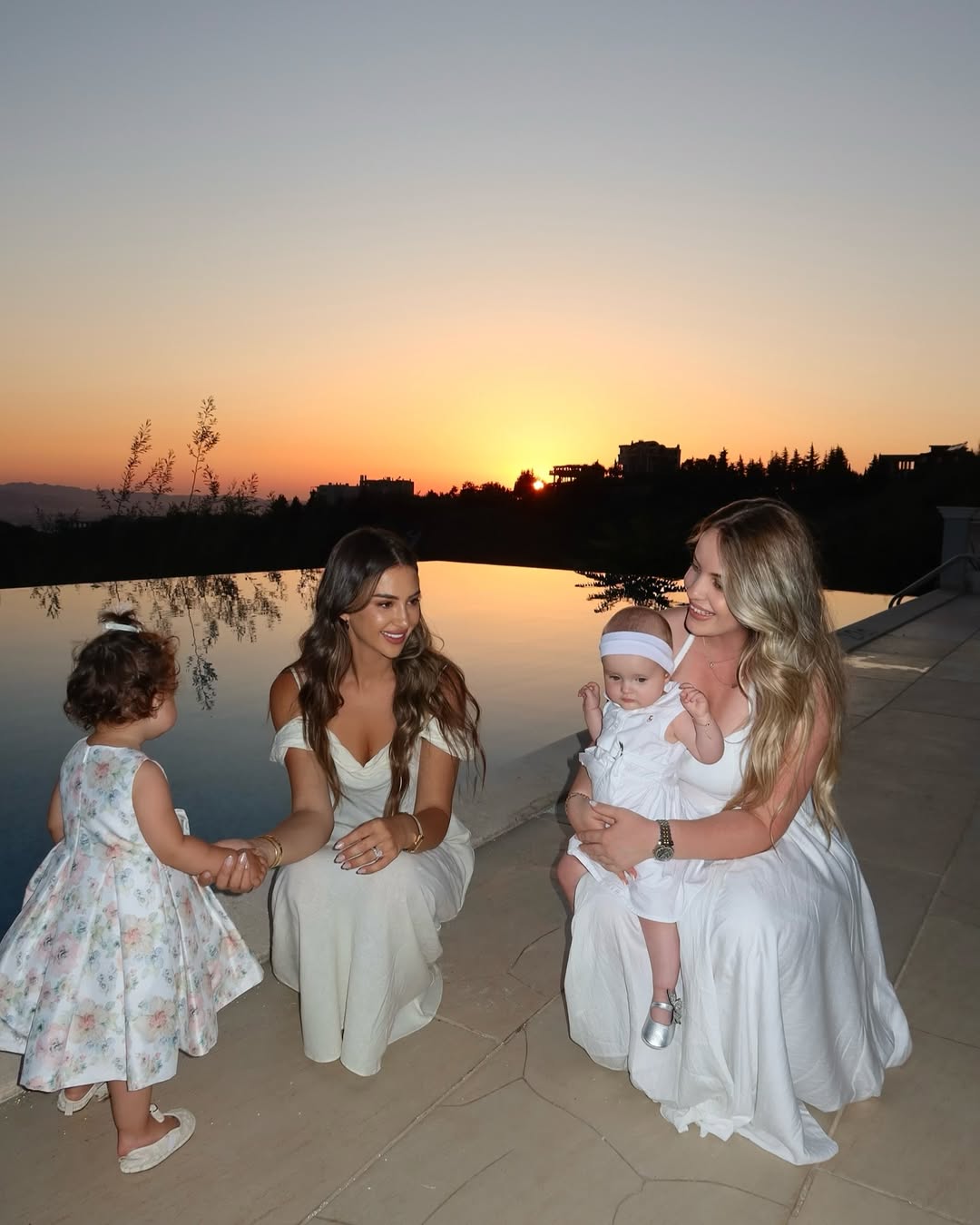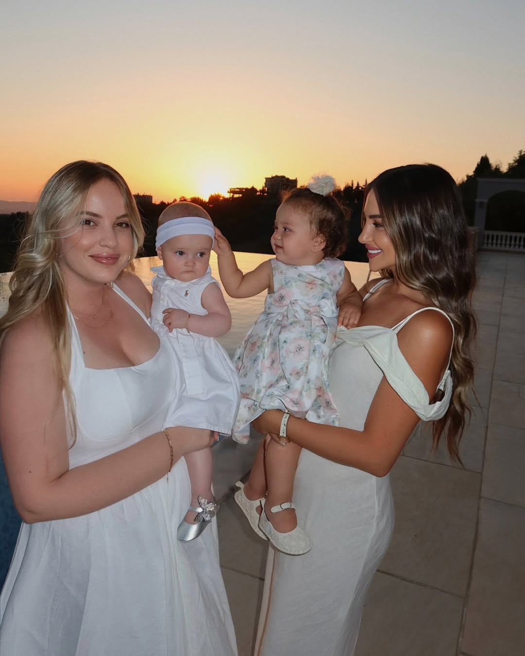 Të veshura me fustane të bardha dhe të rrethuar nga dashuria, dy nënat duken të lumtura dhe krenare teksa rrisin së bashku vajzat e tyre.