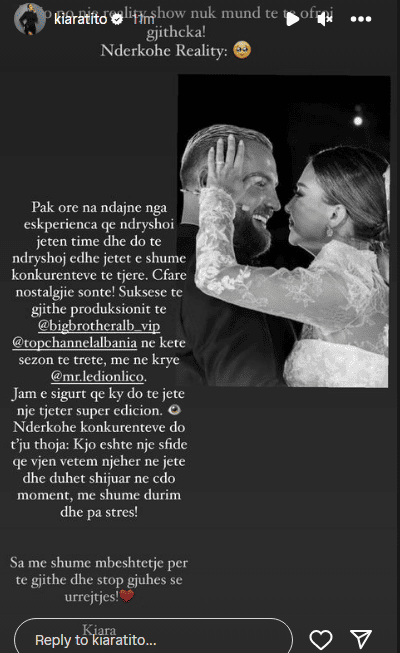 Ndërkohë duket se ish-banorët e dy edicioneve të mëparshme janë bërë paksa nostalgjikë për BB VIP. Një ndër ta është edhe Kiara Tito, e cila së fundmi ka bërë një postim në “Instastory” ku i uron suksese të gjithë produksionit si dhe ka një këshillë për banorët e rinj.