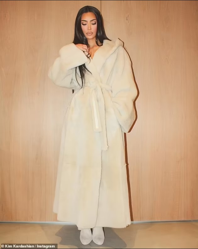 Palltoja ishte e lidhur me rripin në belin e hollë të themelueses së “SKIMS”, ndërsa ajo godiste poza të ndryshme në divan, u përkul për të treguar çizmet e bukura prej kamoshi dhe duke qëndruar e gjatë.
