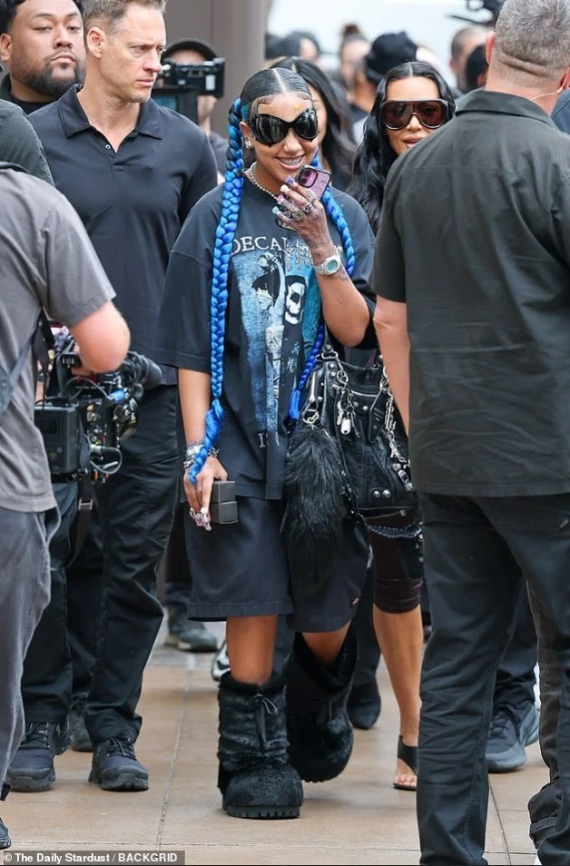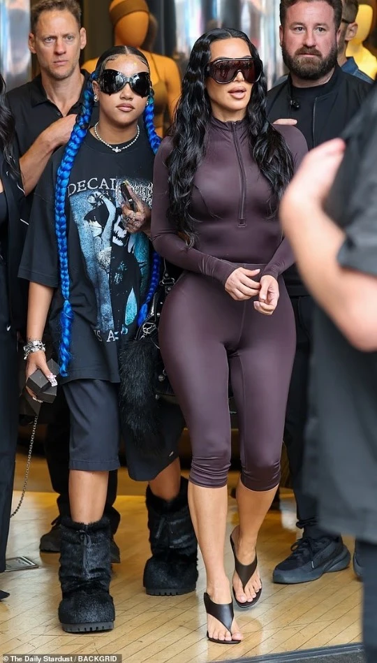 North, tashmë pothuajse po aq e gjatë sa e ëma, tregoi stilin e saj unik me gërsheta blu elektrike, një bluzë me grafikë, pantallona basketbolli dhe syze dielli mburojë, duke tërhequr sytë e të pranishmëve.