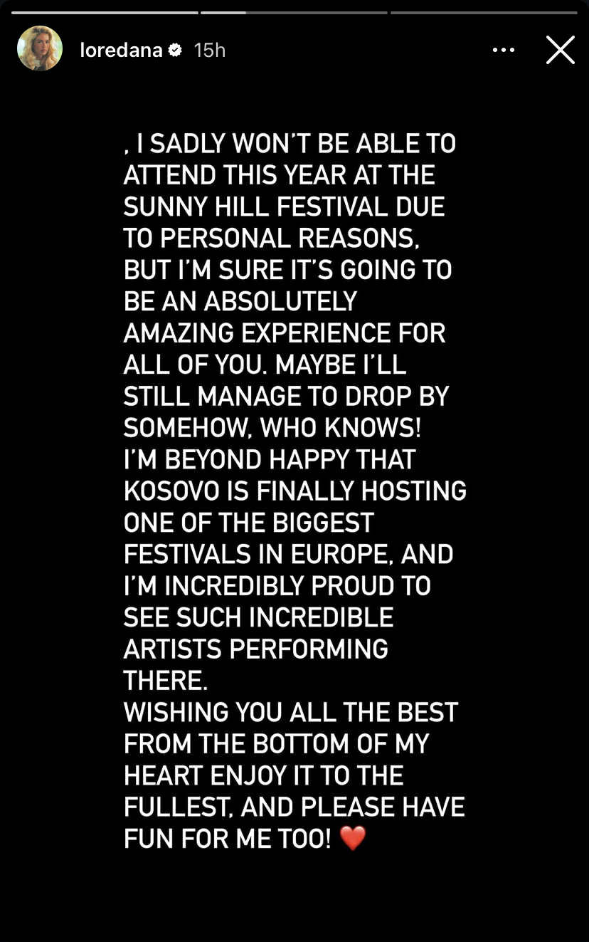 Këngëtarja shqiptare, Loredana ka bërë të ditur përmes një postimi në rrjetet sociale se nuk do të mund të marrë pjesë në festivalin Sunny Hill këtë vit për arsye personale.